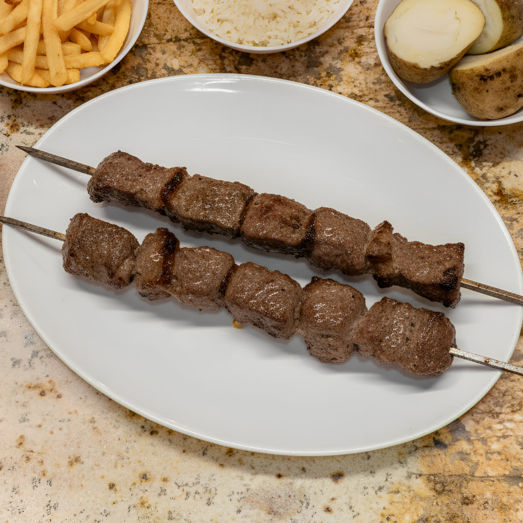 Tender cubes of marinated beef threaded onto skewers and grilled over open flame, offering a succulent, charred exterior and juicy centre. Typically served with a side of salad, rice, fries or potatoes.