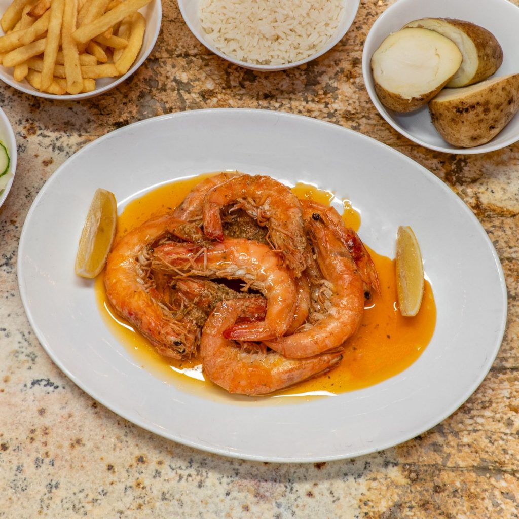 Succulent prawns sautéed in a rich, aromatic garlic and olive oil sauce with a splash of white wine and a hint of lemon — a classic Portuguese favourite that delivers bold seaside flavour in every bite.